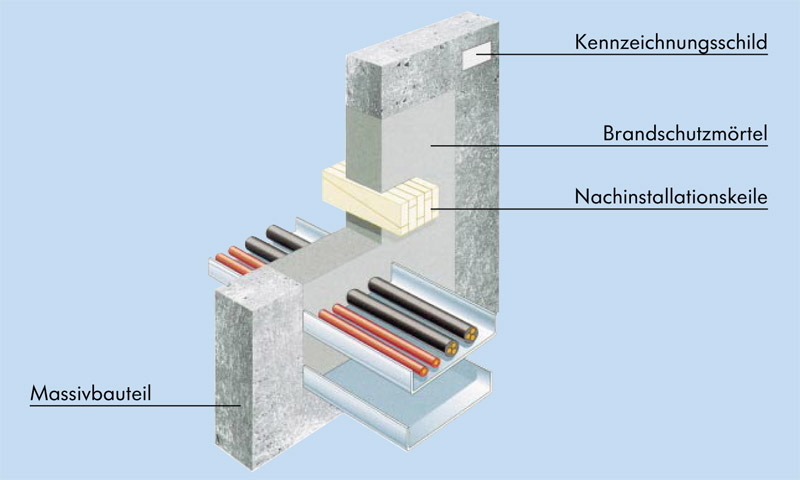 Das Hartschott besteht aus einem Spezialmörtel, der temperaturabbauend wirkt. Das Hartschott ist dicht gegen Feuer und Rauchgase, spritz- und löschwasserfest sowie alterungsbeständig.