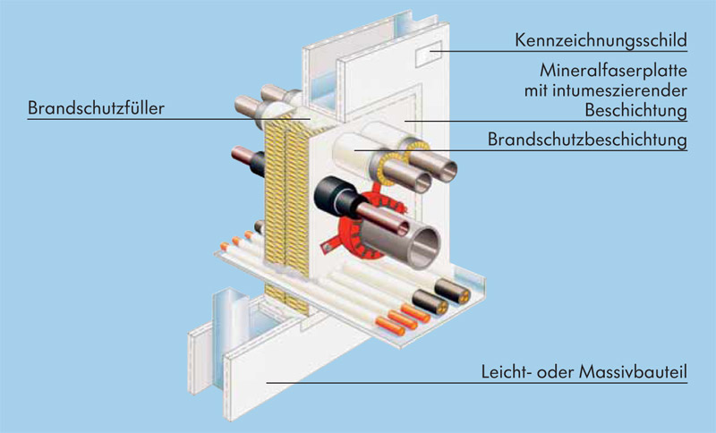 Das Abschottsystem besteht aus zwei 60mm starken Mineralfaserplatten und einer im Brandfall kühlenden Ablationsbeschichtung. Es ist unempfindlich gegen Wasser, Öl und Benzin, spritz- und löschwasserfest, alterungsbeständig und schalldämmend.